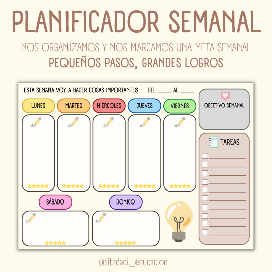 Nos organizamos y nos marcamos metas u objetivos semanales con nuestros estudiantes. Enseñarles la importancia de organizarse desde pequeños es importante, no solo en los estudios sino también en su día a día.